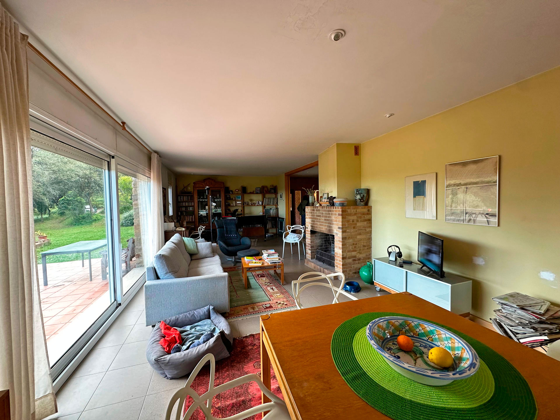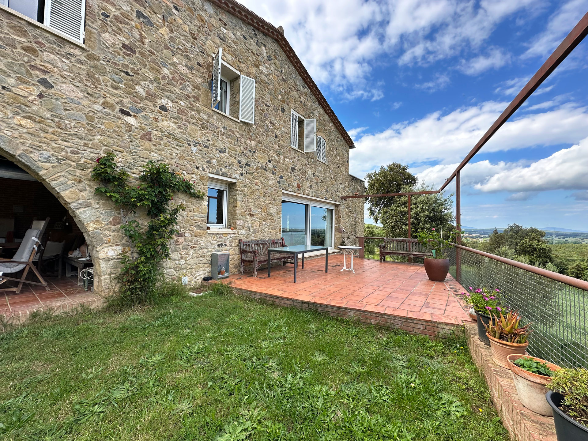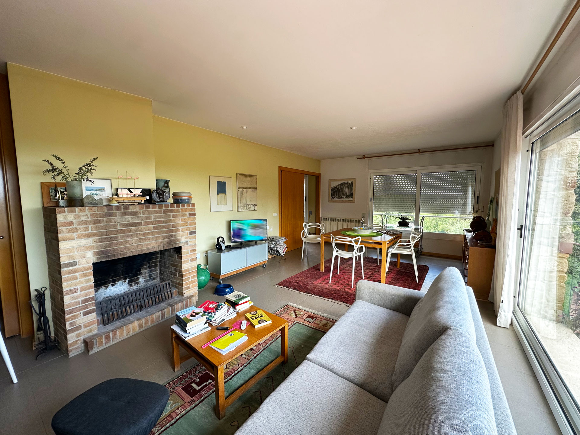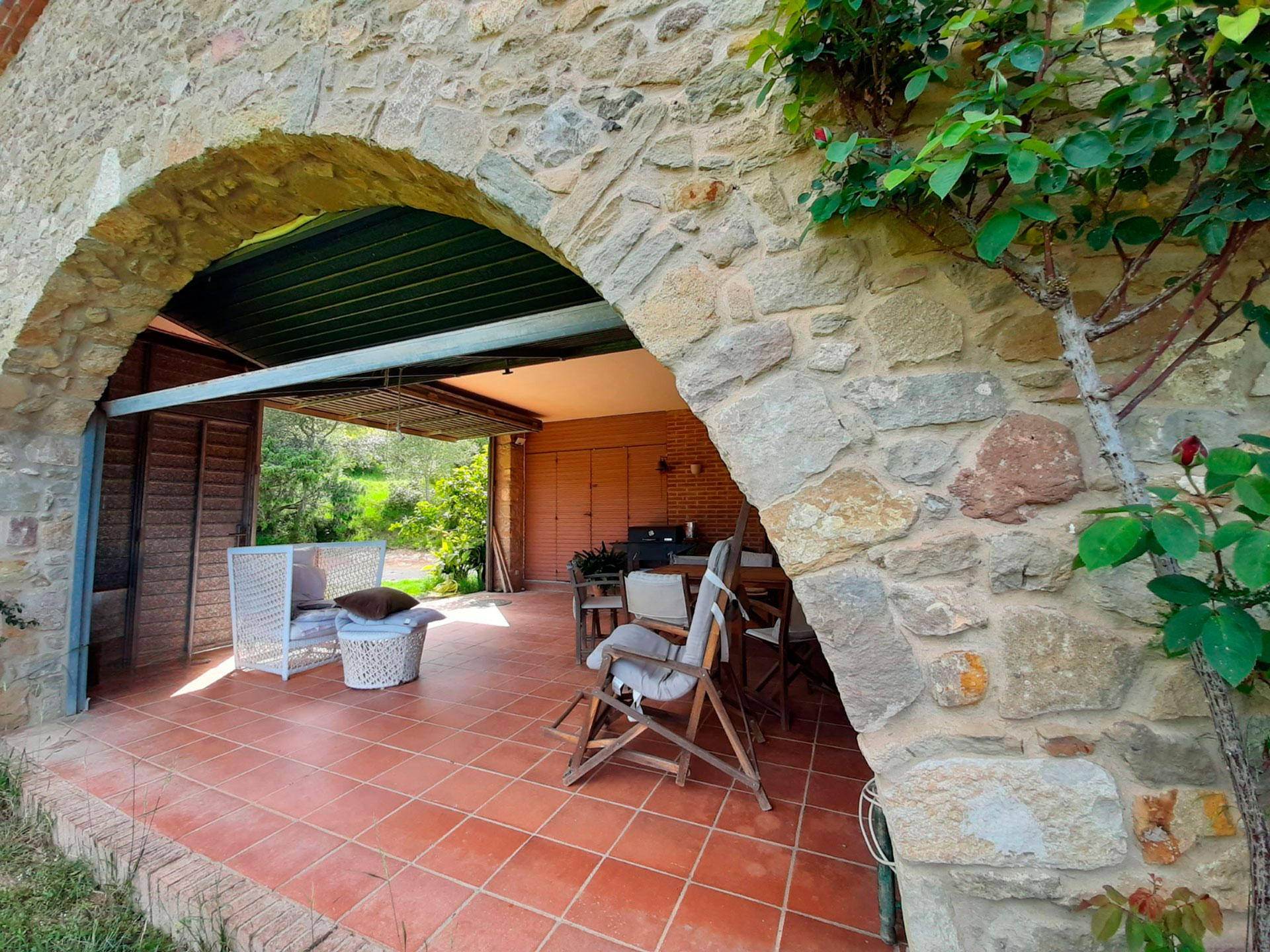 Built in 1992 with a marked rustic style and noble materials, the house combines traditional character with contemporary comfort. Its exposed stone facade, with the large entrance arch and covered porch, create a warm and authentic welcome. Upon entering, we are greeted by a spacious living-dining room presided over by a central fireplace, with large sliding doors that connect to a generous terrace facing the landscape and flooding the entire room with natural light.