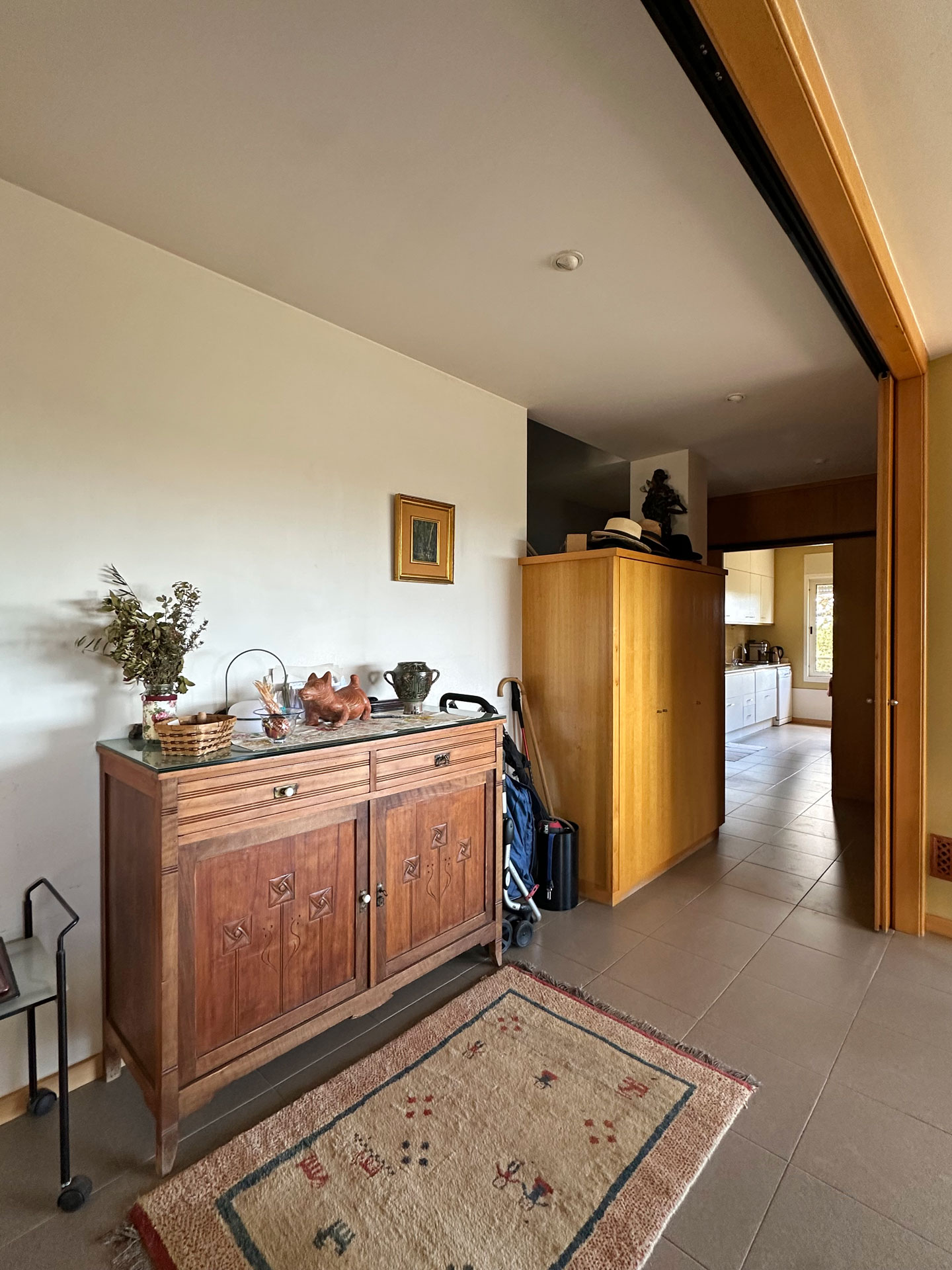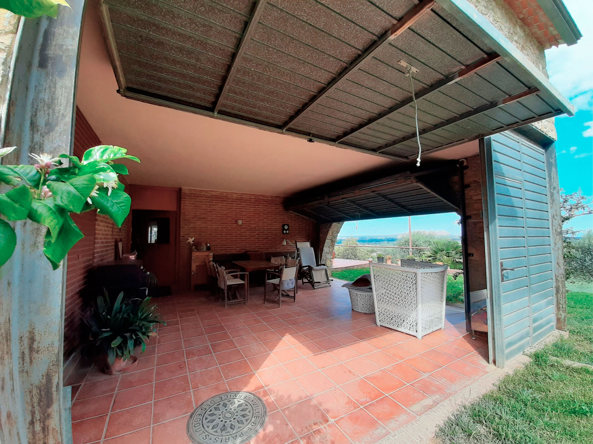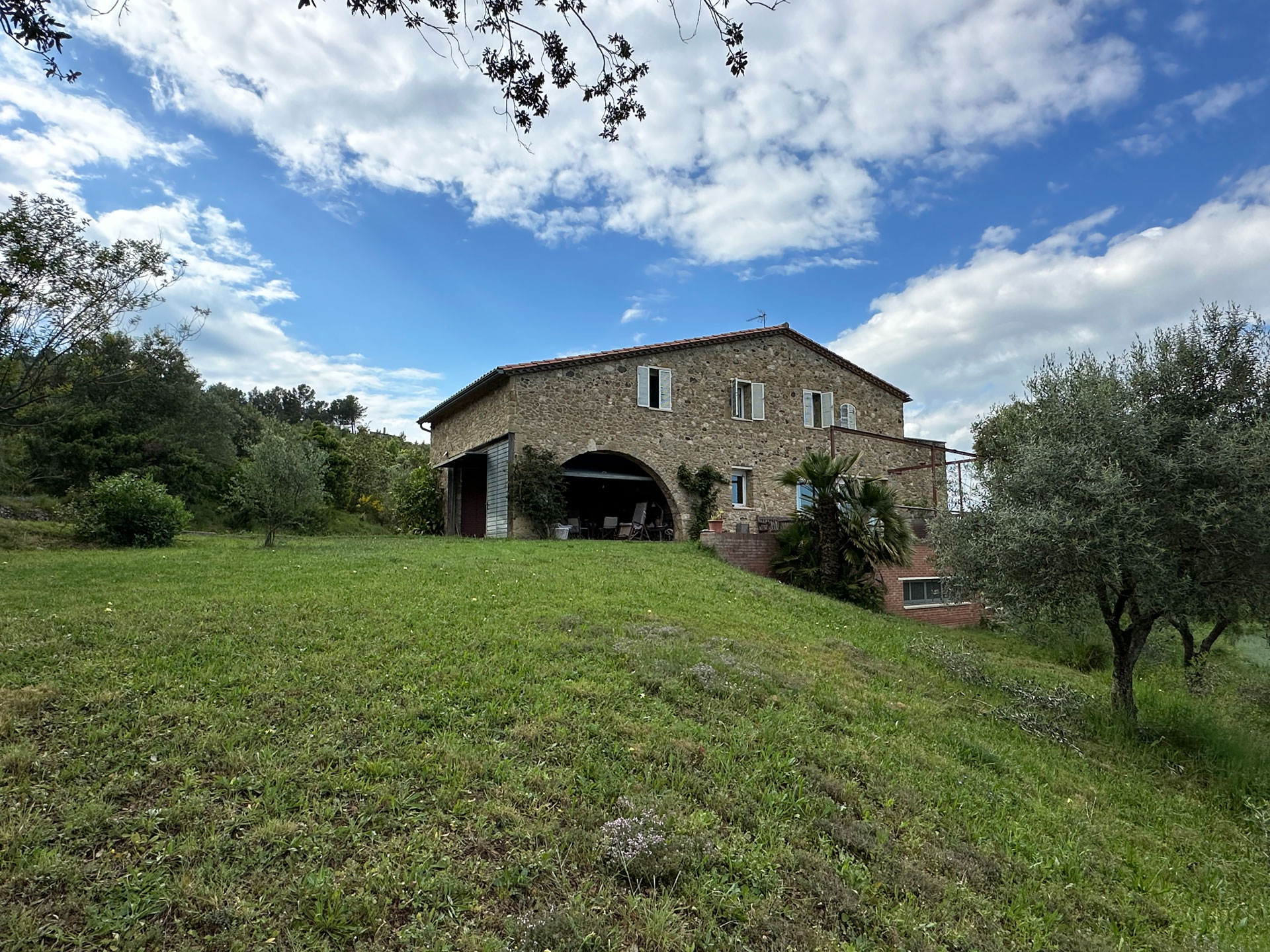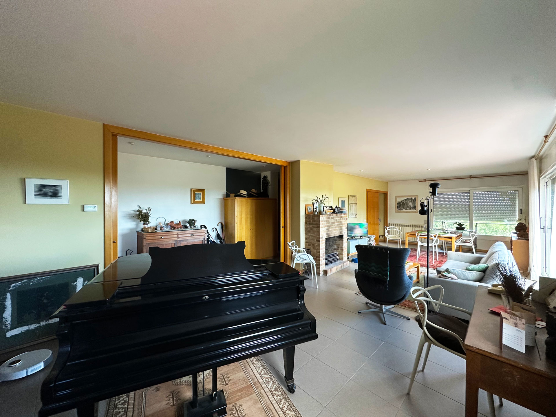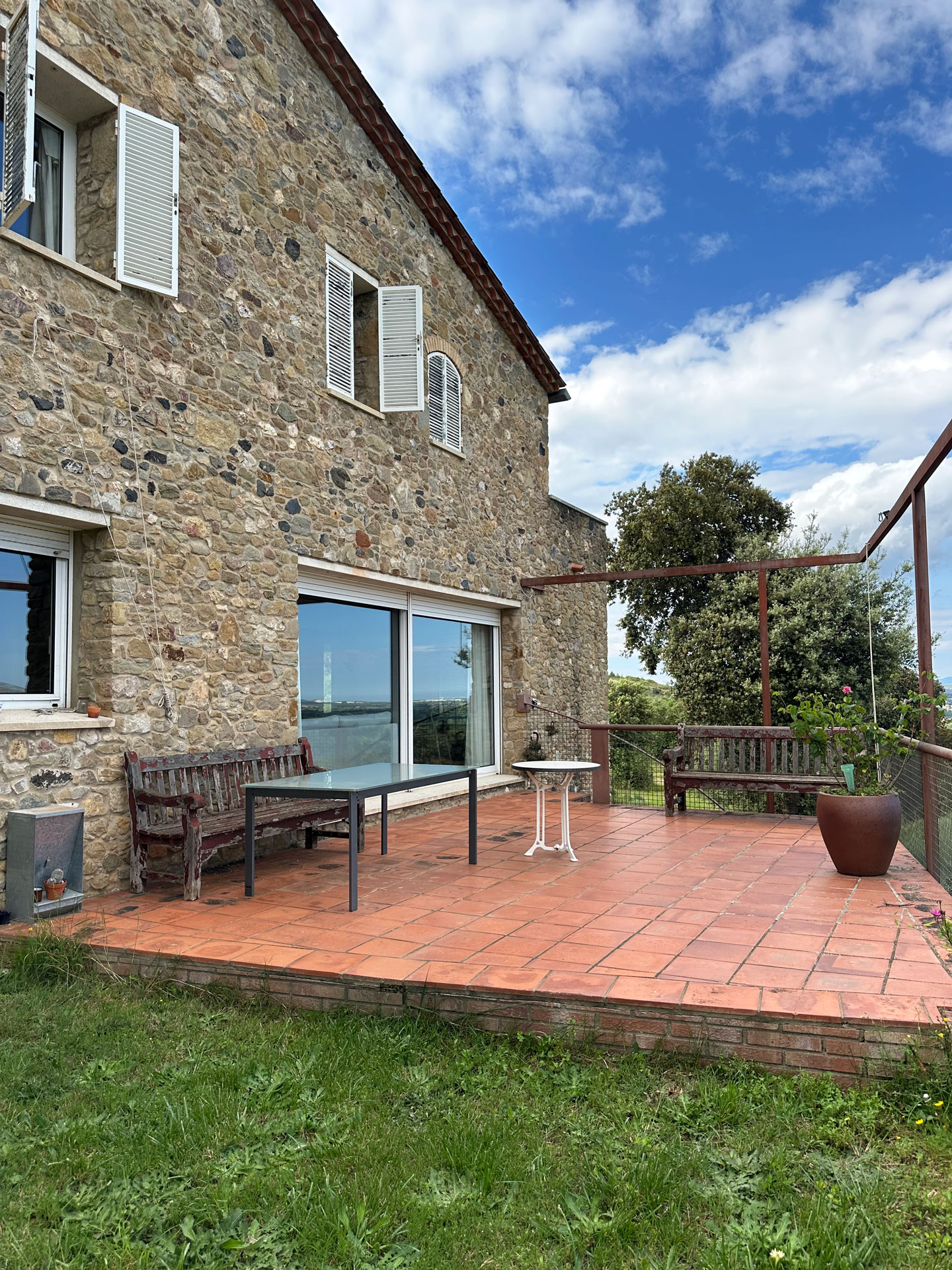 Built in 1992 with a marked rustic style and noble materials, the house combines traditional character with contemporary comfort. Its exposed stone facade, with the large entrance arch and covered porch, create a warm and authentic welcome. Upon entering, we are greeted by a spacious living-dining room presided over by a central fireplace, with large sliding doors that connect to a generous terrace facing the landscape and flooding the entire room with natural light.